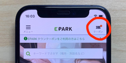 EPARKタウンのクーポンは、EPARKアプリの右上メニューから入手可能です。
