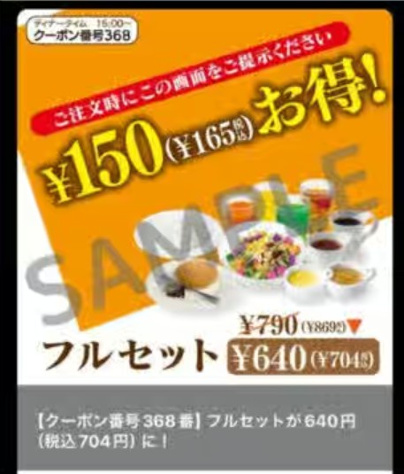 • フルセット165円引き・誕生日クーポン・ドリンクバーセット100円引き・お会計3%OFFの配信が確認できます。