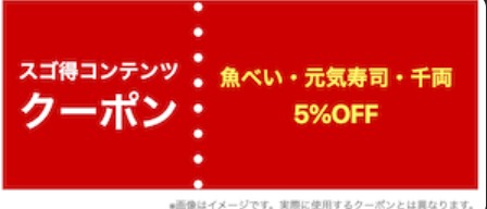 スゴ得コンテンツでは「魚べい」の割引きクーポン他、飲食店や家電量販店などで使えるクーポンが多くあります。